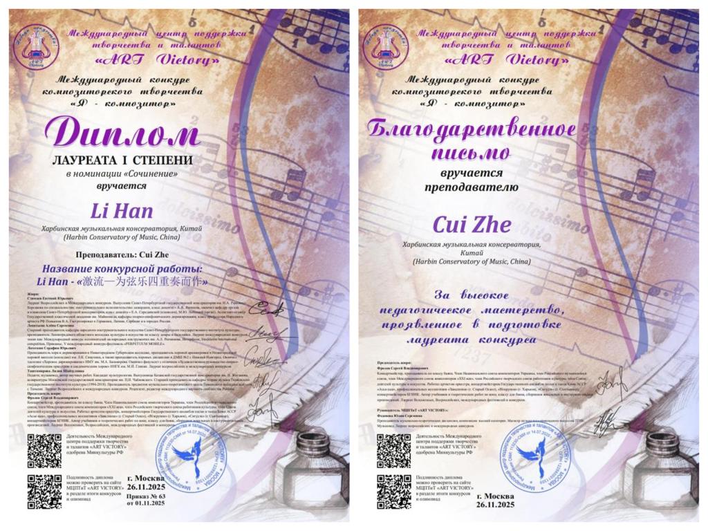 日前,在2025年俄罗斯“作曲家”国际作曲比赛中,作曲系2024级硕士研究生李涵创作的弦乐四重奏作品《激流》(指导教师:崔哲)荣获一等奖。