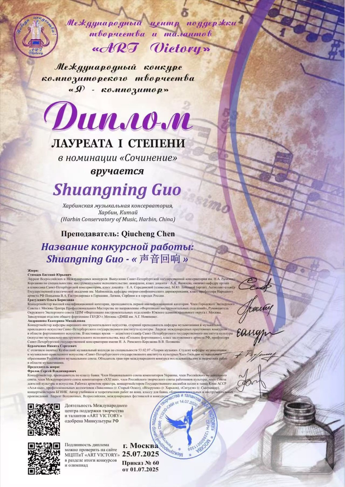 在2025年俄罗斯“作曲家”国际作曲比赛中,作曲系2022级本科生郭双宁创作的木管五重奏作品《声音回响》(指导教师:陈秋成)荣获一等奖。
