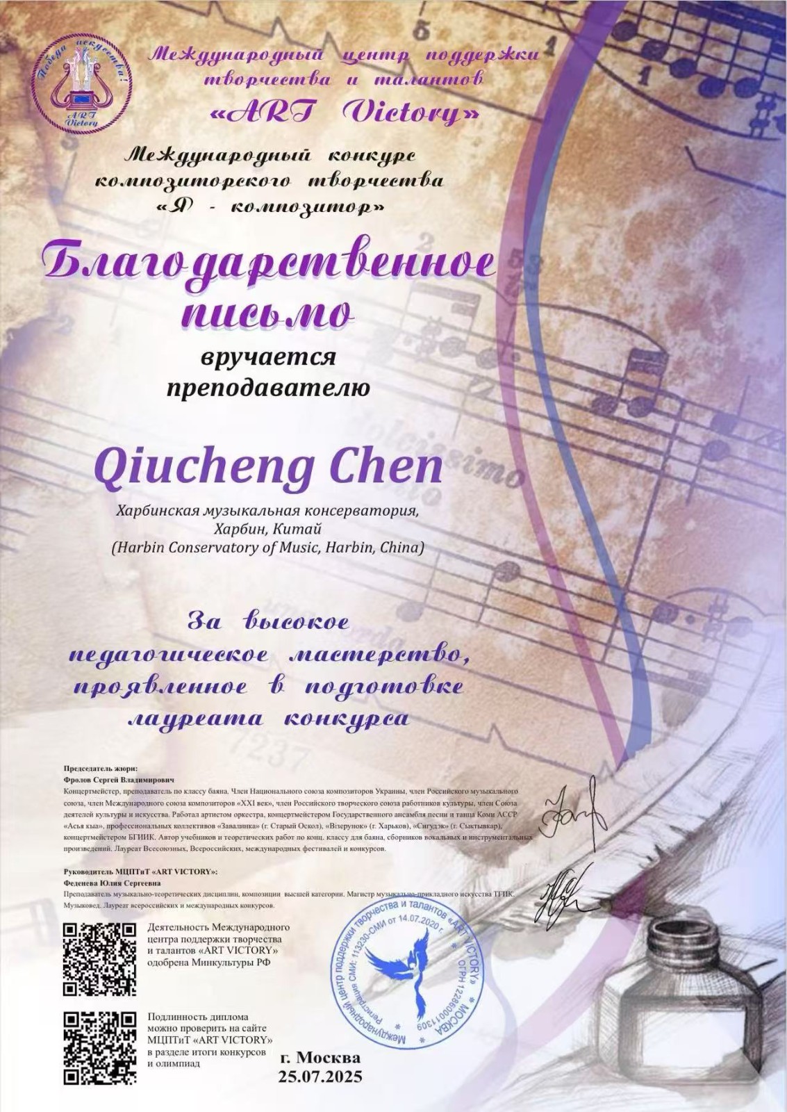 俄罗斯“作曲家”国际作曲比赛由莫斯科“艺术胜利”国际创意和人才支持中心主办,受到俄罗斯联邦文化部的认可以及批准。比赛共设立作曲、编曲、即兴创作等六个奖项,评审团成员由来自包括中国、俄罗斯、瑞典、美国、德国、比利时、塞尔维亚、爱沙尼亚、立陶宛、拉脱维亚、挪威、芬兰和奥地利等地的著名音乐家组成。
