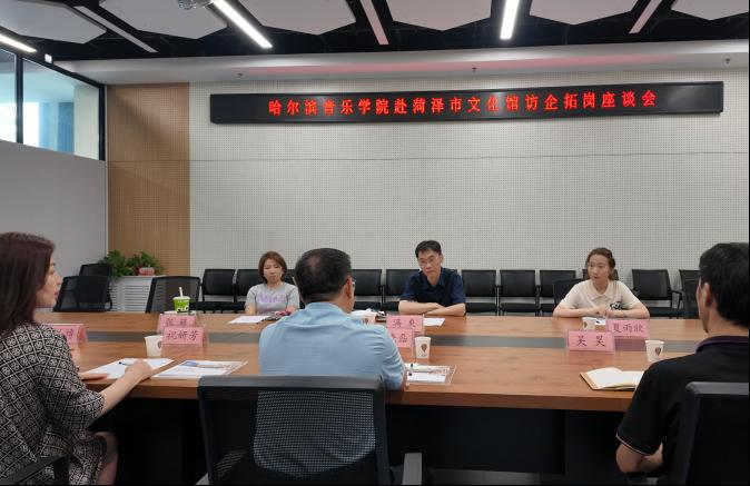 在菏泽市文化馆,菏泽市文化和旅游局副局长郝晓磊对满爽一行的到来表示欢迎,并介绍了菏泽市的文旅特色。副馆长祝妍芳介绍了文化馆的文化活动、师资力量、公益课程以及非遗项目的基本情况。满爽介绍了院系概况、专业方向,并了解文化馆对毕业生的素质要求、专业技能需求以及就业岗位的设置情况。双方围绕文艺演出、基层培训、学生实习实践等重点方向提出合作意向。满爽表示,希望进一步增进学院与文化单位的合作,共同培养符合行业发展的应用型人才。