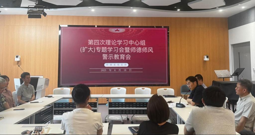 6月18日下午,作曲系党总支在主楼A207会议室召开2025年第四次理论学习中心组(扩大)专题学习会暨师德师风警示教育会。会议由党总支书记满爽主持,作曲系党总支理论学习中心组成员及全体专任教师参加学习会议。