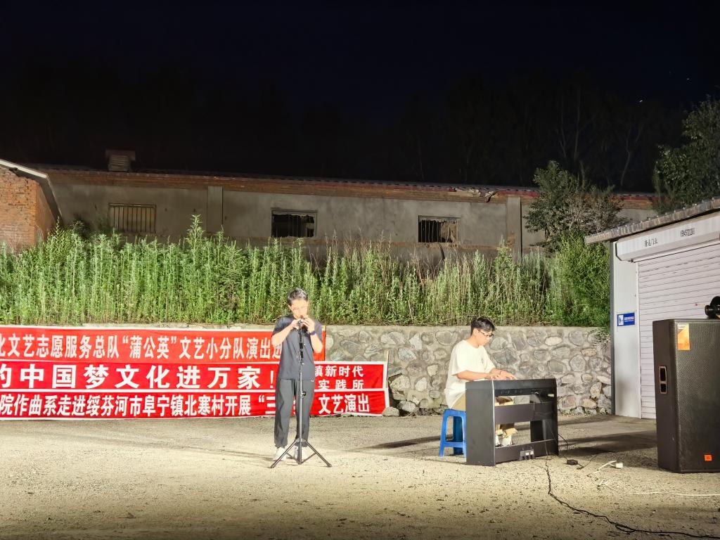 实践团成员与农村青年文艺骨干、市群众艺术馆合作进行文艺演出,展示青年文艺培训学习成果,同时为培养文艺人才、推动文艺下乡,弘扬中华优秀传统文化,进一步增强文化自信,为全面推进乡村振兴注入更加强劲的文化动能。演出开始前,指挥专业学生为现场老年人排练小合唱。