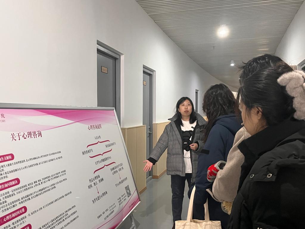 在心理健康中心参观的过程中,2023级全体新生在辅导员夏雨欣的带领下,向心理健康中心教师陈浩然学习了解了心理咨询流程、设备仪器预约流程。