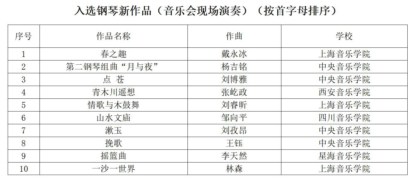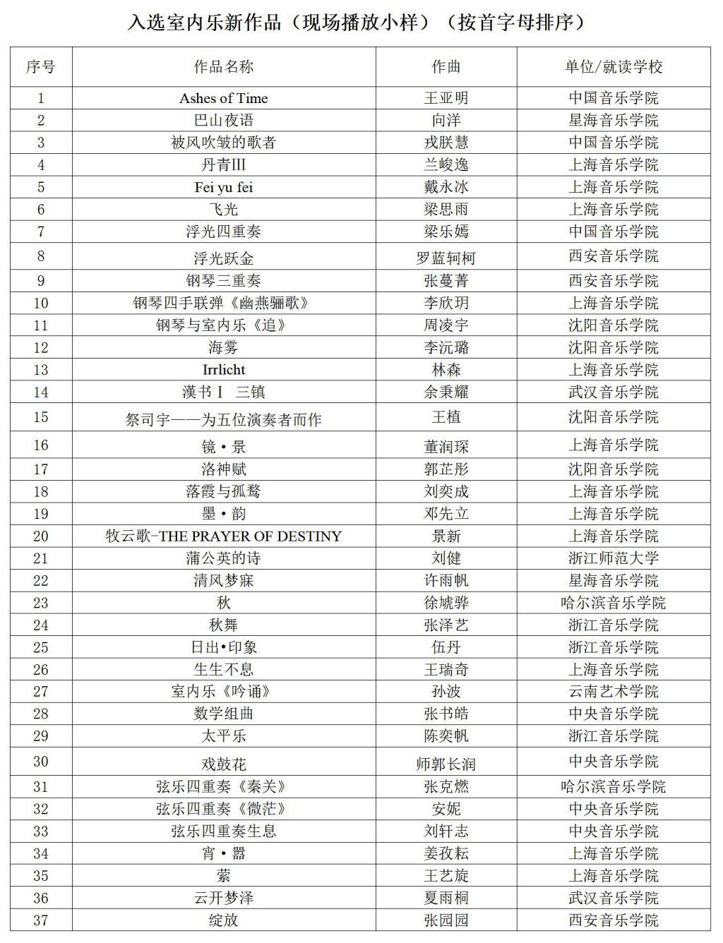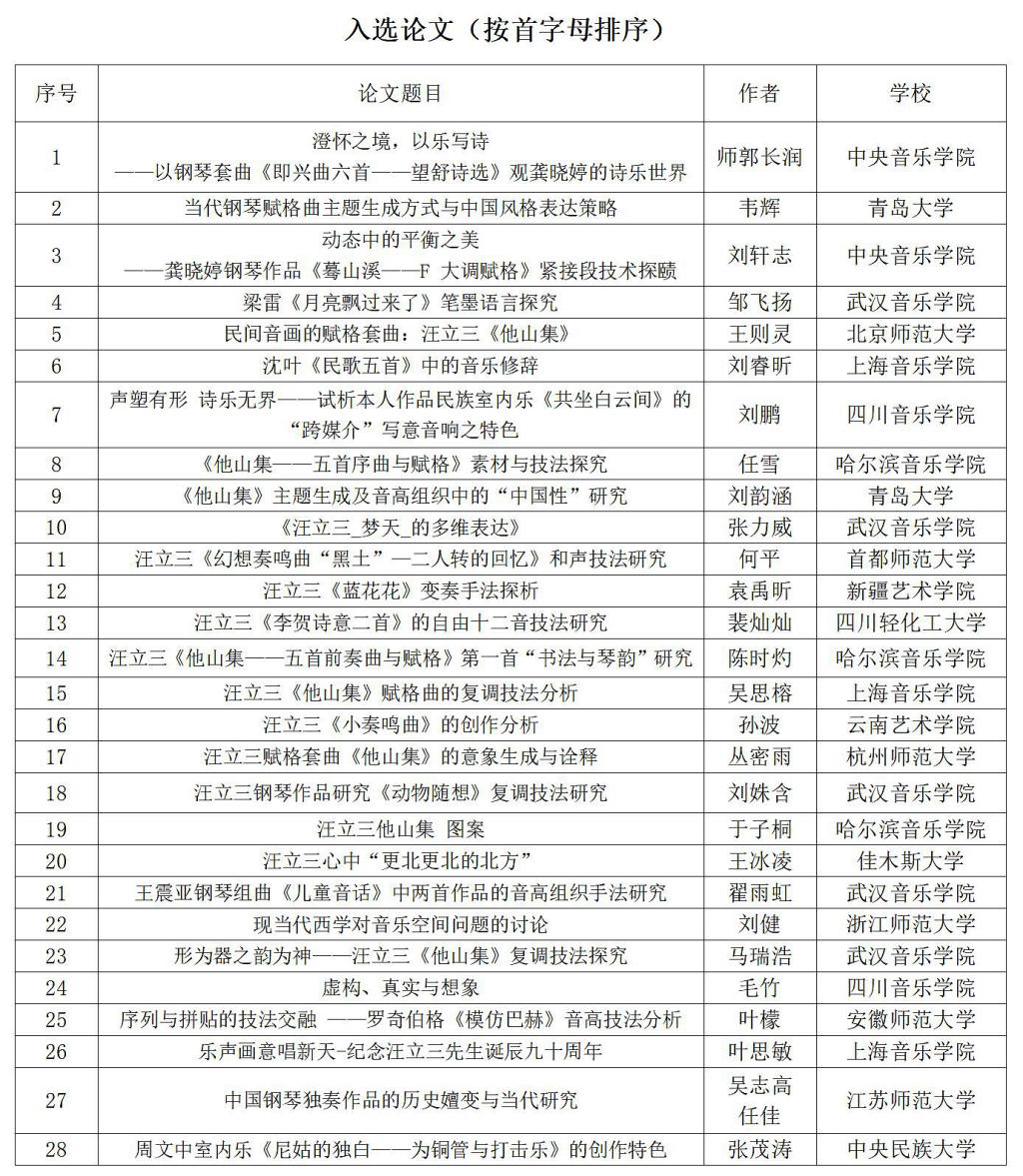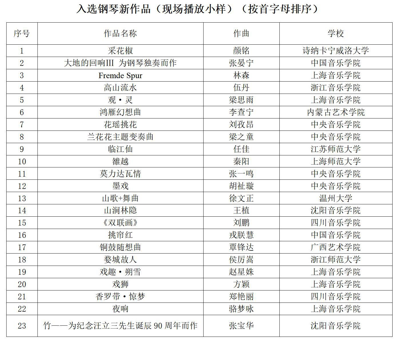 “2023汪立三诞辰90周年暨钢琴及室内乐创作(哈尔滨)研讨会”论文、作品征集于2023年7月启动,收到国内外38所高校师生的踊跃投稿。经过15位评委的公平、公正和精心评选,最终评出研讨会入选论文共计28篇,进行现场宣讲;入选钢琴新作品共计33首,其中10首举行音乐会现场演奏,其他23首举行研讨会现场播放小样;入选室内乐新作品共计48首,其中11首举行音乐会现场演奏,其他37首举行研讨会现场播放小样。现将结果公布如下: