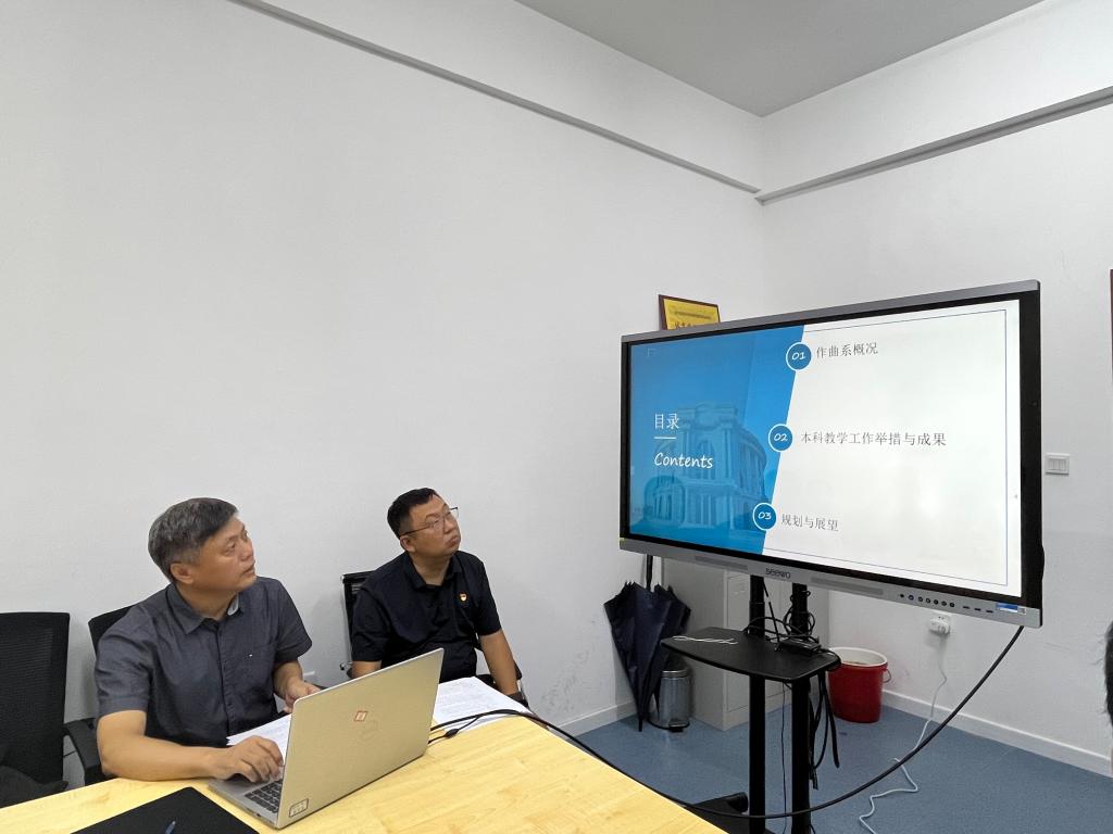 作曲系主任张磊面向作曲系全体教职工介绍了本系基本概况、顶层设计、党建引领、师资队伍、学科建设、专业建设、课程建设、实践教学、质量监控、学风建设、特色培育等模块的内容。