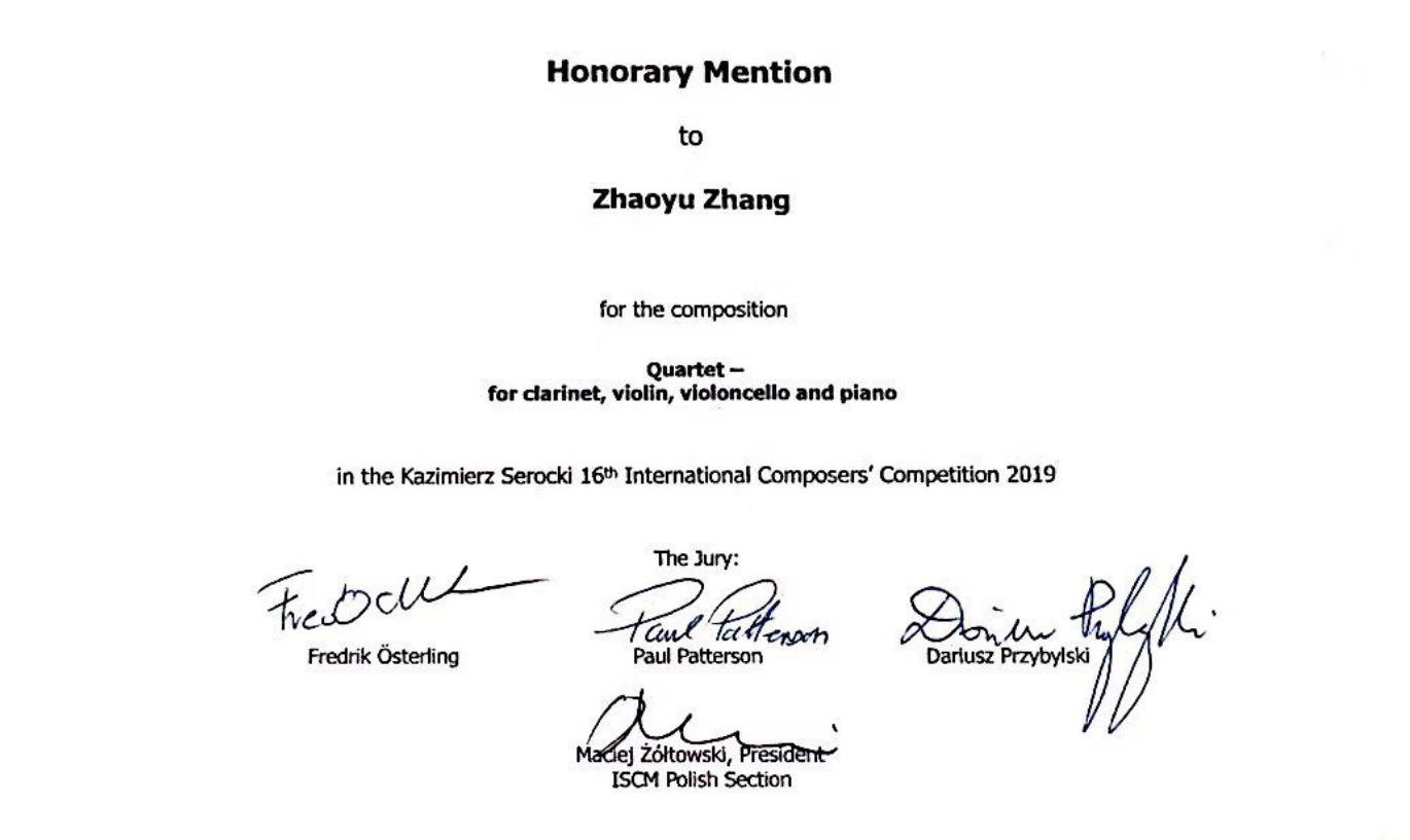2019年10月4日至6日,第十六届卡兹米尔兹·赛罗茨基作曲比赛在波兰举行,我院作曲系青年教师张兆宇的作品《四重奏》(为单簧管、小提琴、大提琴、钢琴而作)荣获荣誉提名奖。