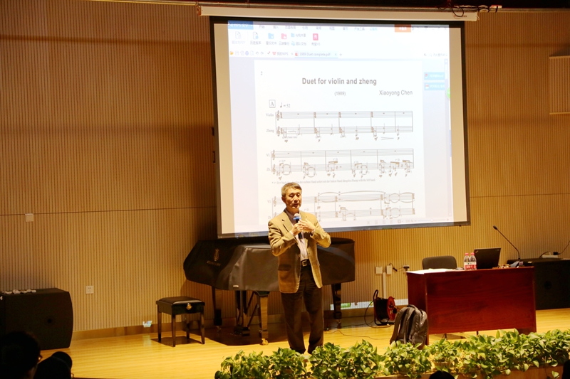 讲座中,作曲家陈晓勇教授首先同师生们分享了他在德国的求学经历,讲述了他在德国33年的音乐创作历程。随后,陈教授通过播放作品片段讲解音乐听觉与内心感知的关系,重点讲解了现代音乐作品的构思以及作品中如何用声音表达内容,使之成为音乐。讲座最后,他讲到,在扎实学习古典音乐的基础上才能创作出优秀现代音乐作品,希望同学们多听古典音乐,发现古典音乐中新内容,这样才能创作出优秀的作品。